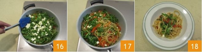 Mischt die Zutaten gut 16, um sie gleichmäßig zu verteilen 17, und serviert dann eure Vollkornspaghetti mit roten Paprika, Rucola und Feta 18!