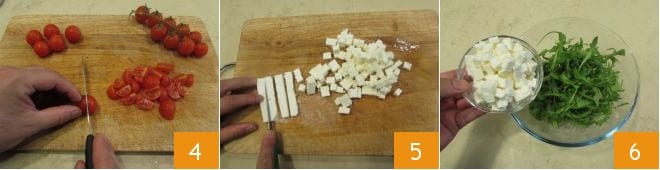 Schneidet nun die Kirschtomaten in zwei Hälften 4 und stellt sie ebenfalls beiseite. Schneidet den Feta in Streifen und dann in Würfel 5 und gebt ihn in eine Schüssel mit dem Rucola 6.