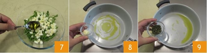 Gießt 20 g Öl dazu 7 und vermischt die Zutaten. Stellt sie beiseite und bringt inzwischen einen Topf mit Wasser zum Kochen, das für die Zubereitung der Pasta benötigt wird. Sobald es kocht, salzt es. Geht zur Zubereitung der Sauce über: Nehmt in diesem Moment eine Antihaftpfanne mit breitem Boden und lasst darin den Knoblauch mit dem restlichen Öl (40 g) goldbraun anbraten 8. Sobald er goldbraun ist, entfernt ihn und fügt nun die gehackten Gewürze hinzu 9.