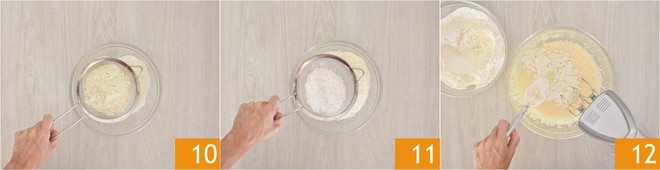Sieben Sie in einer Schüssel das Mehl 10, das Backpulver und die Maisstärke 11. Fügen Sie die trockenen Zutaten nach und nach zur Eigelbmischung hinzu, wobei Sie ständig mit dem Mixer rühren 12.