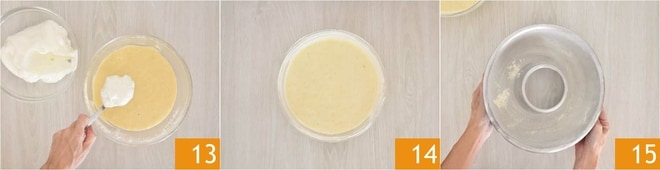 Als letztes schlagen Sie die steifgeschlagenen Eiweiße darunter, zuerst ein paar Esslöffel 13, mischen Sie mit einem Spatel und dann den Rest vorsichtig mit Bewegungen von unten nach oben. Der Teig ist fertig 14. Fetten und mehlen Sie eine Kranzform mit 24 cm Durchmesser 15.