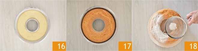 Gießen Sie den Teig hinein 16 und backen Sie ihn in einem vorgeheizten statischen Ofen bei 170 ° für 45-50 Minuten auf der unteren Schiene des Ofens. Sobald der Kuchen gebacken ist, nehmen Sie ihn aus dem Ofen 17, lassen Sie ihn vollständig abkühlen, entfernen Sie ihn aus der Form und servieren Sie ihn mit einer Prise Puderzucker 18.