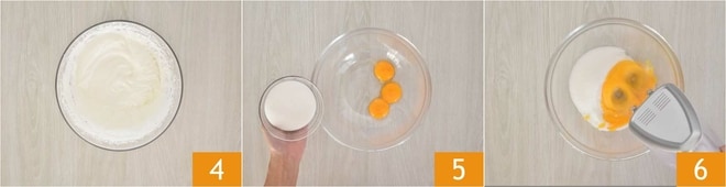 Die Eiweiße sollten weiß und schaumig sein 4. Geben Sie die Eigelbe mit dem restlichen Zucker in eine Schüssel 4 und schlagen Sie sie mit einem Mixer auf 6.