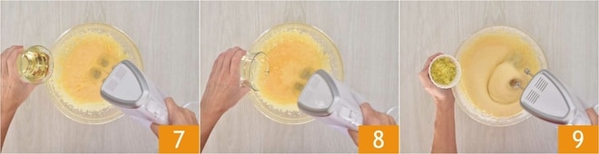 Sie sollten eine helle und schaumige Mischung erhalten. An dieser Stelle das Öl langsam einfließen lassen 7 und dann das Wasser 8, den Teig einige Sekunden bearbeiten und schließlich mit der Zitronenschale aromatisieren 9.