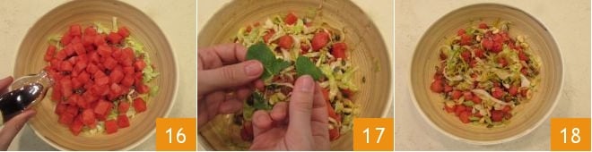 Vermischen Sie alles, dann fügen Sie zuletzt die Wassermelonenwürfel hinzu, würzen Sie mit Balsamico-Essig 16 und mischen Sie erneut, um alle Aromen zu vereinen. Zum Schluss mit den Blättern von frischer Minze parfümieren 17. Ihr frischer Wassermelonen-Salat ist servierfertig 18!
