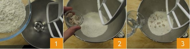 Um die weichen Brötchen herzustellen, gebt das Mehl in die Schüssel einer Küchenmaschine mit einem Flachrührer 1, fügt die zerbröckelte Hefe 2 und wenig Wasser 3 hinzu.