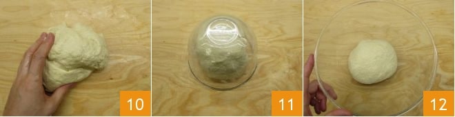 Gebt den Teig auf eine Arbeitsfläche 10, lasst ihn 10 Minuten unter einer Schüssel ruhen 11. Dann formt mit den Händen einen glatten Teigball, gebt ihn in eine große Schüssel 12,