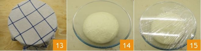 deckt mit einem Tuch ab und lasst ihn 3 Stunden bei Zimmertemperatur gehen 13. Nach den 3 Stunden 14, deckt die Schüssel mit Frischhaltefolie ab 15 und lasst sie 10 Stunden im Kühlschrank gehen.