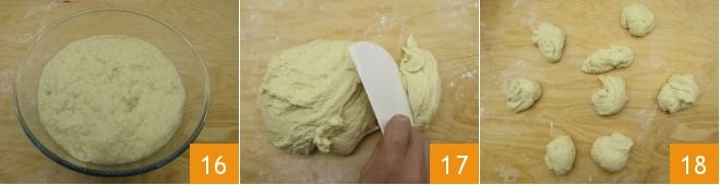 Holt nun den gegangenen Teig heraus, lasst ihn etwa eine halbe Stunde bei Zimmertemperatur wieder aufgehen 16. Mithilfe eines Teigschabers den Teig in 8 Stücke von etwa 90 g teilen (17-18).