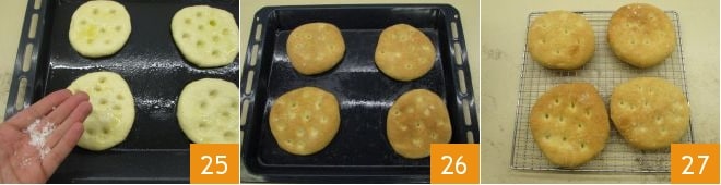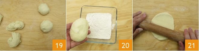 Formt jedes Stück zu einer runden Form 19 und lasst es 5 Minuten ruhen. Wälzt jedes Stück in Mehl 20 und rollt es dann mit einem Nudelholz 21 aus, um runde Brötchen mit einem Durchmesser von etwa 6-7 cm zu erhalten.