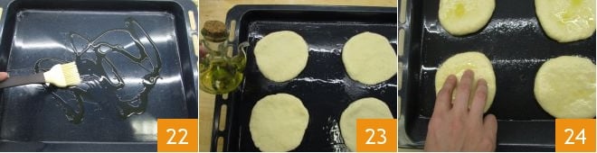 Bepinselt den Boden eines Backblechs mit Öl 22, legt die Brötchen darauf und gebt einen dünnen Ölstrahl über jedes 23, lasst die Brötchen eine weitere Stunde ruhen. Dann macht mit den Fingerspitzen Löcher in den Teig 24