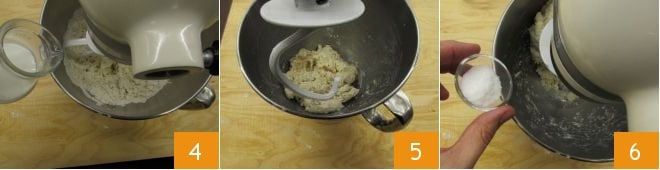 Schaltet die Maschine ein und gebt nach und nach Wasser und Milch 4 hinzu, abwechselnd. Sobald das Mehl die Flüssigkeiten aufgenommen hat, ersetzt den Flachrührer durch den Knethaken 5 und knetet weiter, indem ihr auch den Zucker 6 hinzufügt,