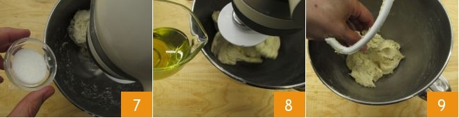 das Salz 7 und das Olivenöl in einem dünnen Strahl 8. Knetet, bis der Teig sich verbunden hat und sich von den Schüsselwänden löst 9.