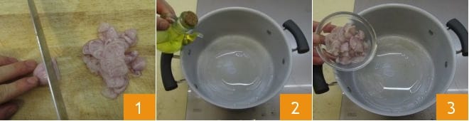 Für die Zubereitung der Wirsingsuppe putzen und schneiden Sie zunächst die Schalotte in feine Streifen 1. Erhitzen Sie das Olivenöl in einem großen Topf 2, geben Sie dann die Schalotte hinzu 3 und lassen Sie sie 5 Minuten bei schwacher Hitze schmoren.