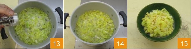 Gegen Ende der Kochzeit nach Belieben pfeffern 13, dann die Hitze ausschalten 14 und Ihre Wirsingsuppe sofort heiß servieren 15.