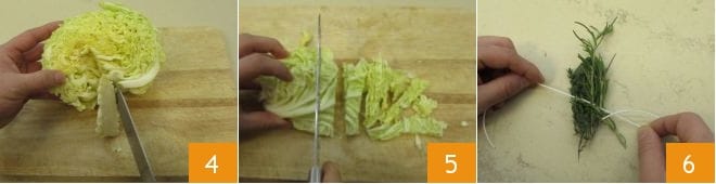 In der Zwischenzeit nehmen Sie den Wirsing, entfernen Sie die härtere mittlere Rippe 4, und schneiden Sie ihn in Streifen 5. Spülen Sie den Wirsing unter fließendem Wasser ab und lassen Sie ihn abtropfen. Nehmen Sie inzwischen die Thymian-, Rosmarinzweige und Lorbeerblätter und binden Sie sie mit einem Faden zusammen 6, so lassen sie sich am Ende der Kochzeit leichter aus dem Topf entfernen.