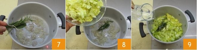 Wenn die Schalotte gut geschmort ist, fügen Sie das Kräuterbündel 7 und den Wirsing 8 hinzu, lassen Sie alles bei mittlerer Hitze 5 Minuten anbraten, dann gießen Sie das Wasser hinzu 9