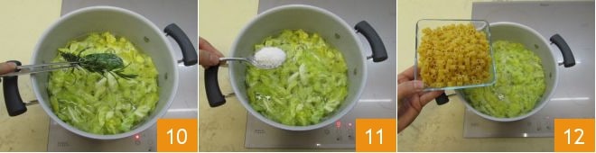 Entfernen Sie die Kräuter mit einer Kochzange 10, salzen Sie 11 und bringen Sie das Wasser zum Kochen. Wenn das Wasser kocht, geben Sie die Pasta hinzu 12 und kochen Sie sie für 10 Minuten oder gemäß der Packungsanweisung.