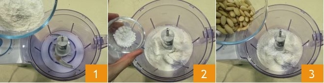 Um die 5-Minuten-Muffins zuzubereiten, geben Sie das Mehl 00 1 und das Backpulver 2 in den Behälter eines Mixers mit Klingen. Fügen Sie auch die Mandeln 3 hinzu,