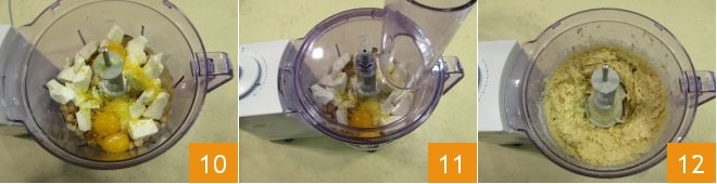 Sobald alle Zutaten 10 hinzugefügt sind, schließen Sie den Mixer 11 und mixen Sie alles, bis eine cremige, glatte und homogene Mischung 12 entsteht.