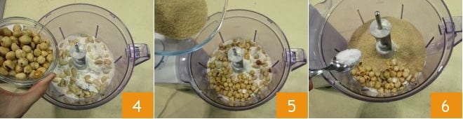die geschälten Haselnüsse 4, den braunen Zucker 5 und den halben Teelöffel Salz 6.