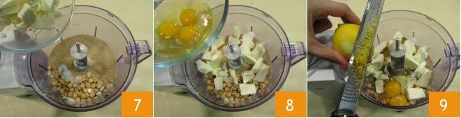 Fügen Sie zuletzt die Butter in Stücken 7, die 3 Eier 8 und die abgeriebene Schale einer Zitrone 9 hinzu, wobei Sie nur den gelben Teil verwenden.