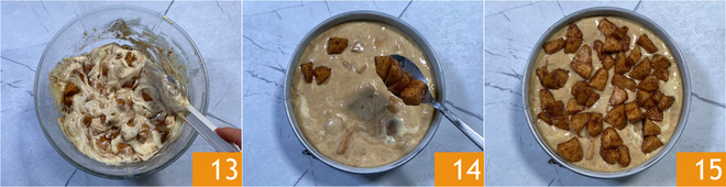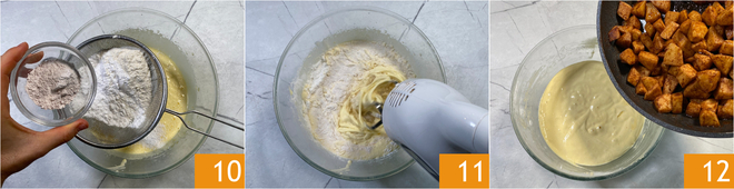 Dann das Mehl, die Speisestärke und das Backpulver sieben 10. Schalten Sie den Mixer auf eine niedrigere Geschwindigkeit, um die trockenen Zutaten zu integrieren 11, bis ein homogener Teig entsteht. Nun zwei Drittel der angedünsteten Äpfel hinzufügen 12.