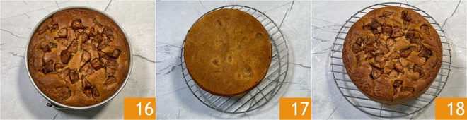 Nach der Backzeit (mit einem Zahnstocher prüfen) den Kuchen aus dem Ofen nehmen und etwa zehn Minuten abkühlen lassen 16, bevor Sie ihn auf ein Gitter stürzen, um vollständig abzukühlen 17. Ihr 7-Gläser-Apfelkuchen ist servierbereit 18!