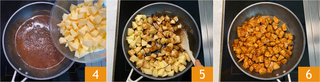 Geben Sie die gewürfelten Äpfel hinzu 4 und braten Sie sie 1-2 Minuten bei starker Hitze an 5. Schalten Sie die Hitze aus und lassen Sie sie abkühlen 6.