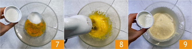 In der Zwischenzeit den Teig zubereiten: In einer Schüssel die Eier und den Zucker 7 vermischen, dann mit einem elektrischen Mixer 10-15 Minuten lang schlagen 8. Wenn Sie eine luftige und schaumige Masse erhalten haben, fügen Sie das Pflanzenöl in einem dünnen Strahl hinzu, während Sie weiter mixen. Dann den Joghurt dazugeben 9.