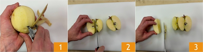 Um die Apfelpfannkuchen zuzubereiten, kümmern Sie sich zunächst um die Äpfel. Schälen Sie sie 1 und schneiden Sie sie zuerst in Hälften und dann in Spalten 2. Entfernen Sie das Kerngehäuse 3.