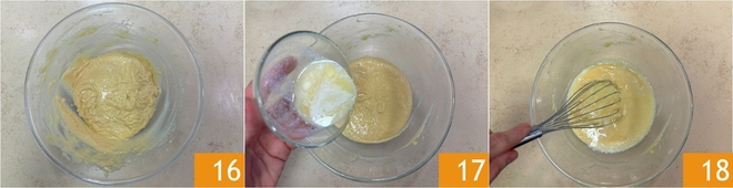 Sobald Sie eine homogene Masse erhalten haben 16, fügen Sie die mittlerweile abgekühlte Butter hinzu 17 und rühren Sie erneut, um alles zu vermischen 18.