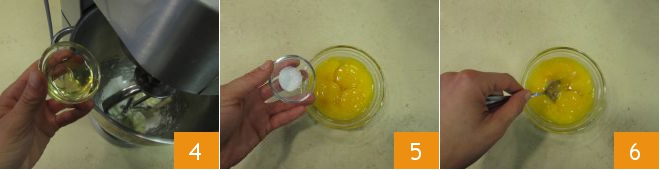 Azionate la macchina a velocità bassa e aggiungete il miele 4. In una ciotolina a parte versate i tuorli e il sale 5, mescolate per farlo sciogliere 6.