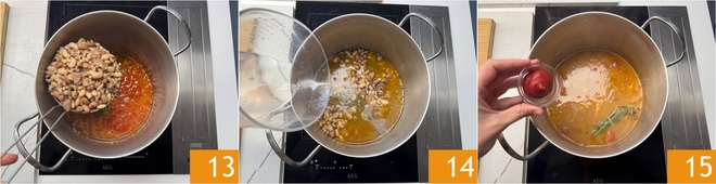 In der Zwischenzeit sollten die Bohnen gekocht sein, also geben Sie sie in den Topf 13 zusammen mit ihrem Kochwasser, dann noch etwas Wasser zugeben 14. Ab dem Wiederaufkochen auf kleiner Flamme 45-60 Minuten köcheln lassen. In den letzten Minuten der Kochzeit (überprüfen Sie, ob die Bohnen zart sind) das Tomatenmark 15 und das Salz hinzufügen.