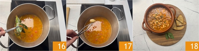 Zum Schluss das Kräutersträußchen 16 und den Knoblauch 17 entfernen. Lassen Sie Ihre Bohnensuppe einige Minuten ruhen, bevor Sie sie mit rohem Öl, Pfeffer und Brotcroûtons servieren 18!