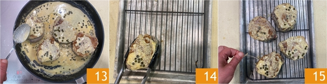 Erhöht die Hitze erneut und setzt das Garen für weitere 2 Minuten auf jeder Seite fort, dabei gelegentlich das Fleisch mit der Sauce begießen 13. Nehmt die Filets aus der Pfanne und legt sie auf ein Gitter 14, entfernt das Garn 15 und lasst sie ruhen, während ihr euch der Sauce widmet.