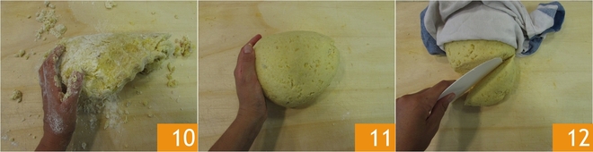 Es reicht aus, den Teig 10 zu einer homogenen Konsistenz zu bringen, der weich, aber nicht klebrig (und auch nicht zu fest) 11 sein sollte. Decke den Teig mit einem trockenen und sauberen Tuch ab. Bringe in einem großen Topf Wasser zum Kochen, um die Gnocchi zu kochen, und salze es, sobald es kocht; währenddessen nimm nach und nach eine Portion Teig und halte den Rest bedeckt 12.