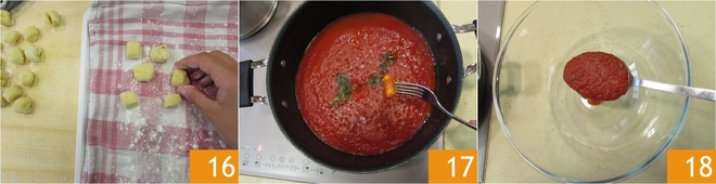 Lege die Gnocchi nach und nach auf ein Tablett, das mit einem sauberen, leicht mit Hartweizenmehl bestäubten Tuch ausgelegt ist 16. Sobald die Gnocchi fertig sind, entferne den Knoblauch aus der Soße 17 und gib fast die ganze Soße in eine sehr große Schüssel 18.
