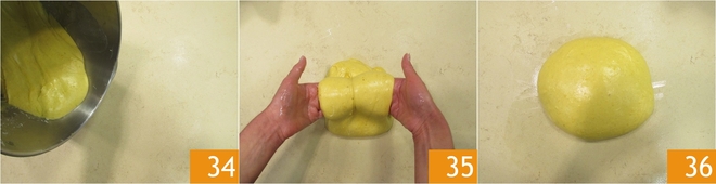 Nach den 10 Minuten starten Sie die Küchenmaschine noch für ein paar Sekunden. Nun befeuchten Sie Ihre Hände und übertragen den Teig auf eine leicht gebutterte Arbeitsfläche 34. Führen Sie ein paar Slap and Fold-Falten durch, indem Sie den Teig heben und auf sich selbst umdrehen, immer mit befeuchteten Händen 35. Lassen Sie den Teig 5 Minuten auf der Arbeitsfläche ruhen, ohne ihn abzudecken 36.