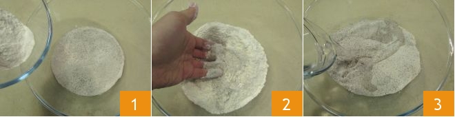 Um die Pizzoccheri zuzubereiten, beginnen Sie damit, das Weizenmehl Typ 0 und das Buchweizenmehl in der angegebenen Menge in eine Schüssel zu geben 1, die beiden Mehle gut zu vermischen 2 und das Wasser bei einer Temperatur von 50° hinzuzufügen 3. Dies erleichtert das Vermischen der Buchweizenstärke.