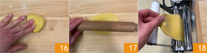 Nachdem die Ruhezeit vorüber ist, teilen Sie den Teig in zwei Hälften. Flachen Sie eine Portion zunächst mit den Händen ab 16, dann rollen Sie sie mit dem Nudelholz aus, um eine möglichst gleichmäßige Form zu erhalten, die in die Nudelmaschine passt 17. Führen Sie den Teig durch die Walzen der Nudelmaschine auf der breitesten Einstellung 18.