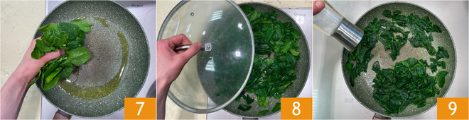 Bereiten Sie inzwischen die Füllung zu: Geben Sie den Spinat in eine Pfanne mit etwas heißem Öl 7 und braten Sie ihn kurz bei hoher Hitze an, senken Sie dann die Hitze und kochen Sie ihn mit Deckel etwa 5-6 Minuten lang 8. Einmal gekocht, salzen Sie ihn 9.
