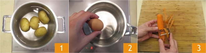 Um den russischen Salat zuzubereiten, kochen Sie zuerst die Kartoffeln für etwa 40 Minuten ab dem Siedepunkt in kaltem Wasser 1. Bereiten Sie die gekochten Eier vor, indem Sie die Eier in kaltes Wasser legen 2 und ab dem Kochpunkt 7 Minuten zählen. Schälen Sie in der Zwischenzeit auch die Karotten 3.