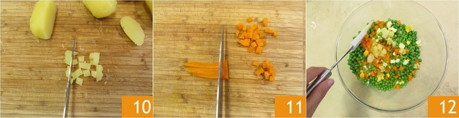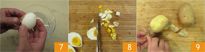 Schälen Sie die Eier, die Sie abgekühlt haben 7, und schneiden Sie sie in Würfel der gleichen Größe 8. Wenn sie gekocht sind, lassen Sie sie abtropfen und schälen Sie sie 9.