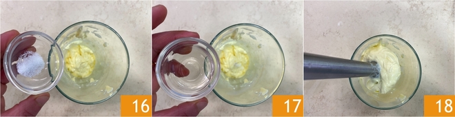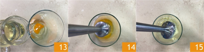 Bereiten Sie nun die Mayonnaise zu: Geben Sie das Ei und das Öl in den Mixerbehälter 13. Pürieren Sie mit einem Stabmixer, wobei das Eigelb in der Mitte des Mixers bleibt 14, bis Sie die Konsistenz der Mayonnaise erreichen 15.