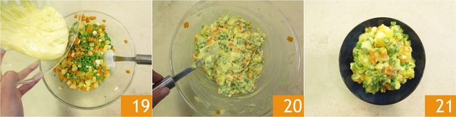 Fügen Sie die Mayonnaise hinzu 19, geben Sie das Öl hinzu und mischen Sie gut, um alles zu verbinden 20. Ihr russischer Salat ist bereit zum Servieren 21!