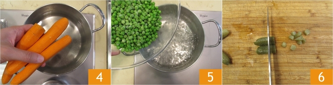 Blanchieren Sie auch die Karotten in gesalzenem kochendem Wasser für 10 Minuten 4; sie sollten etwas knackig bleiben. Blanchieren Sie dann auch die Erbsen 5 für etwa 1 Minute; Sie können das gleiche Wasser der Karotten verwenden. In der Zwischenzeit schneiden Sie die Gürkchen in Würfel von etwa 5 mm 6 und geben Sie sie in eine große Schüssel.