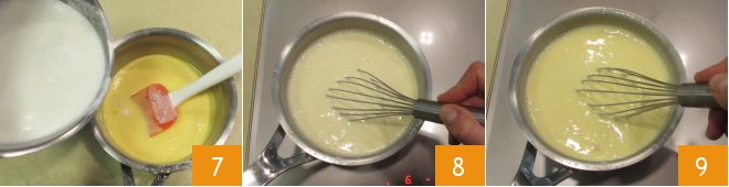 Gießen Sie dann etwas warme Milch in die Mischung, um sie zu temperieren, und entfernen Sie dabei die Schote, die in der Milch gezogen hat 7. Rühren Sie mit dem Teigschaber. Dann fügen Sie den Rest der Milch hinzu und rühren mit einem Schneebesen weiter 8. Stellen Sie die Mischung wieder auf den Herd und lassen Sie sie bei mittlerer Hitze eindicken. Sobald sie eingedickt ist 9, nehmen Sie sie vom Herd und geben sie in eine Schüssel.