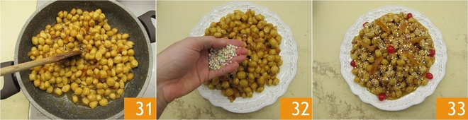 Fügen Sie die gewürfelte kandierte Orange hinzu 28 und rühren Sie erneut um 29. Lassen Sie es 5-6 Minuten abkühlen, dann geben Sie die Struffoli hinein 30.