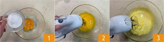 Um das Tiramisù zuzubereiten, bereitet ihr zuerst den Kaffee in der Espressokanne (Moka) zu und lasst ihn in einer flachen, breiten Schüssel abkühlen. Trennt die Eier und teilt Eiweiß und Eigelb – denkt daran: Damit das Eiweiß richtig steif wird, darf kein Eigelb darin enthalten sein. Gebt die Eigelbe in eine Schüssel (sie sollten zusammen etwa 120 g wiegen), fügt die Hälfte des Zuckers hinzu (100 g) 1 und schlagt die Masse mit den elektrischen Rührstäben 2, bis sie hell und schaumig ist 3.